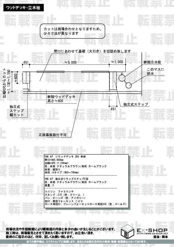 ウッドデッキ設置を家族内で検討してから、いつの間にか2年が経っていました。設置場所が狭いことと、特殊な形状であるため価格も高く、何社も見積もりや施工予定図を取り寄せて検討しましたが、決定的なものを感じることが出来ずにおりました。最初、エクスショップさんにお見積りをお願いした際もこのような経緯があったため、あまり期待していなかったのですが、届いた見積金額と現場見積もり後の「いかがでしょうか?」というフォローの電話に、今までの設置に対する悩みや相談を気軽にお話できるキッカケを頂いた気がしました。積年の設置に対する迷いに対して、プロの視点から新しいご提案をいただいたり、私たちの無理な要望もずいぶん検討して下さり感謝しております。インターネットということで、高額な買い物に最初は不安もありましたが、現場見積もりで職人さんの対応がよかったことと担当者の方の回答のレスポンスが早く、信頼して買い物することが出来ました。実際の設置は、とても感じのよい職人の方が黙々と作業して下さり、予定より早く施工が完了しました。出来上がりにも大変満足しており、設置してよかったと思っております。※結局、ウッドデッキ設置の予算でウッドデッキ及びおしゃれな立水栓まで設置出来ました。
