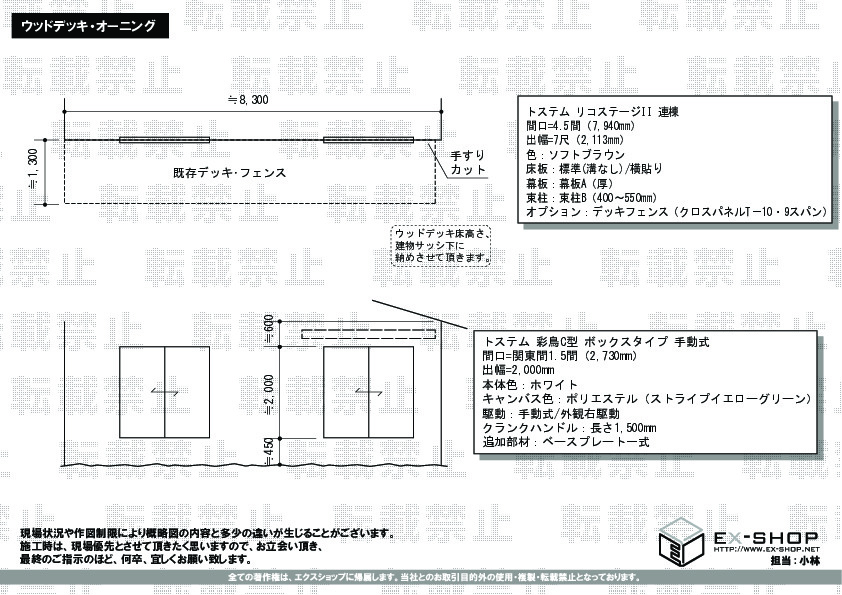 この度は、リコステージII 連棟及び彩鳥C型ボックスタイプの施工ご依頼を頂き誠に有難うございます。施工士の協力の元、素敵なエクステリアが完成致しました事、大変嬉しく存じます。都会の喧騒を忘れる様なのどかな雰囲気が漂う素敵な場所にウッドデッキとオーニングがマッチし、より素敵な空間となっておりますね。ご不安に感じておられるオーニングの隙間に関しましては、メーカー確認により、通常施工でございますので、ご安心頂ければ幸いでございます。今後も、お客様に快適にご利用頂ける様、日々精進して参りますのでまた機会がございましたら是非エクスショップをご利用下さいます様、宜しくお願い致します。