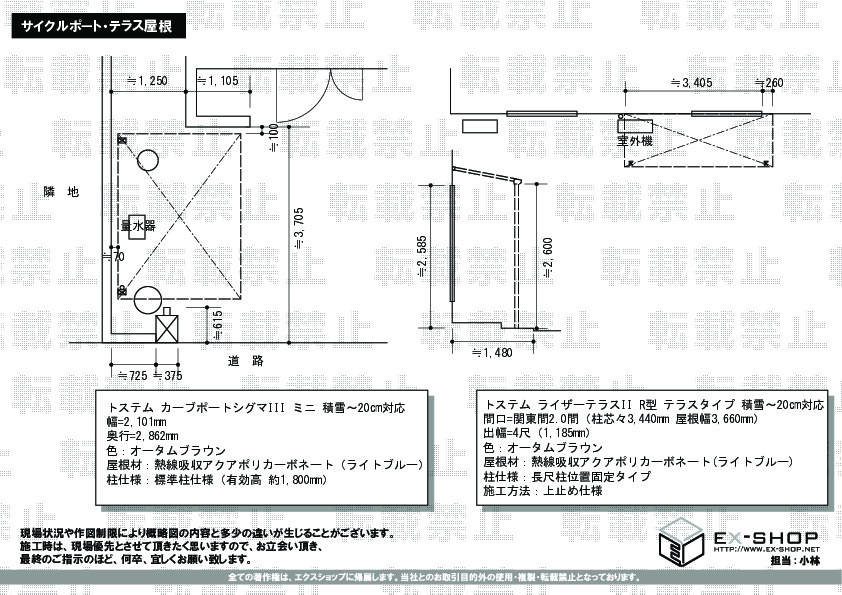 メーカー担当者、並びに、弊社スタッフにお褒めのお言葉をお寄せ頂きまして、誠に有り難うございます。屋根の曲線が美しいカーブポートシグマIII ミニが、雨風の吹き込みをしっかりと遮り、ご家族皆様の自転車をしっかりとお守りしてございますね。屋根幅の広いライザーテラスII R型 テラスタイプも綺麗に納まり、お天気を気にせずお洗濯物を干して頂けますこと、私どもも嬉しく存じます。これからも、お客様の笑顔の為に、日々努力して参りたいと存じますので、また、機会がございましたら、是非エクスショップをご利用頂けますよう、宜しくお願い致します。