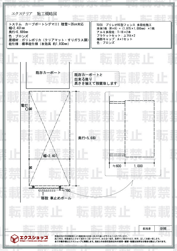 この度はカーブポートシグマIII並びにプリレオR5型フェンスの施工をご依頼頂きまして、誠に有り難うございます。施工完了までお時間を頂戴致しまして、大変申し訳ございませんでした。今後はネット販売の利点を活かした迅速且つきめ細やかな対応を徹底し、お客様に100%ご満足頂ける施工を目指して参りたいと存じます。ブロンズのカーポート・フェンスがとても高級感があり、洗練された素敵なお仕上がりでございますね。ガリレポリカの屋根材は遮光性に大変優れておりますので、雨天時も屋根下を明るく保ち、快適にご利用頂けることと存じます。お気に召して頂きましたら幸いでございます。今後もお客様の笑顔の為日々精進して参りますので、またエクステリアをご検討の際には是非エクスショップをご利用下さいますよう、宜しくお願い致します。