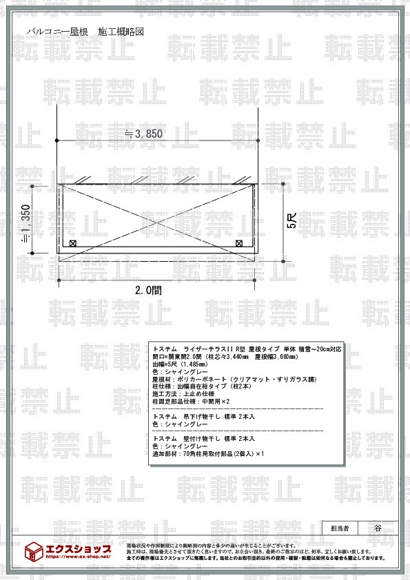 | サイズ | 屋根幅 3,660mm 出幅 1,485mm |