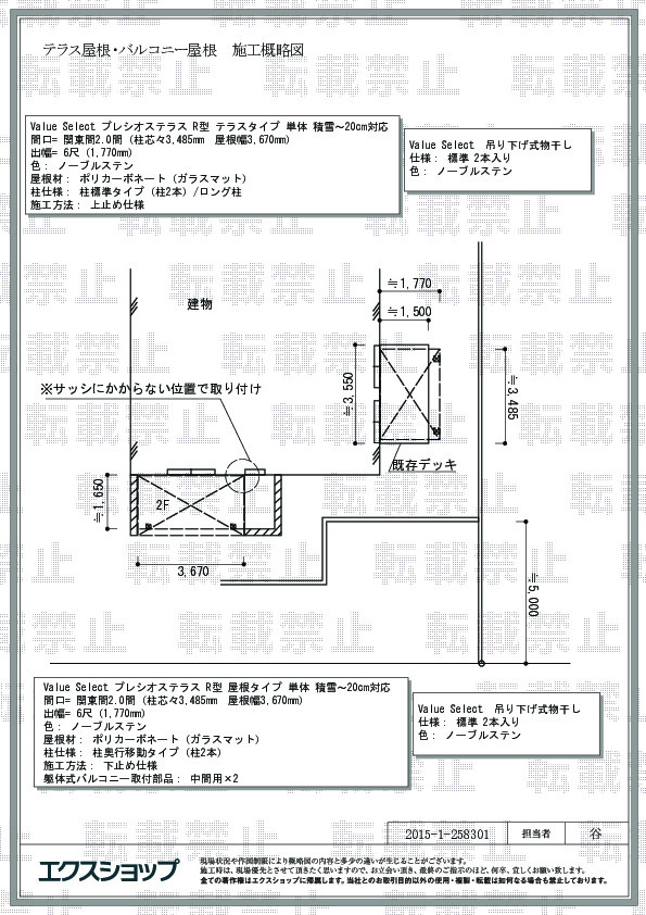 この度はプレスオステラスの施工をご依頼頂きまして、誠に有り難うございます。テラスとバルコニーに屋根を設置頂いたことで雨天時も洗濯物を干すスペースに困ることがございませんね。この度の施工によりお客様の生活がより豊かなものとなりますことを、心より願っております。今後もなお一層の努力を重ねて参る所存でございますので、また機会がございましたらエクスショップをご利用下さいますよう、宜しくお願い致します。