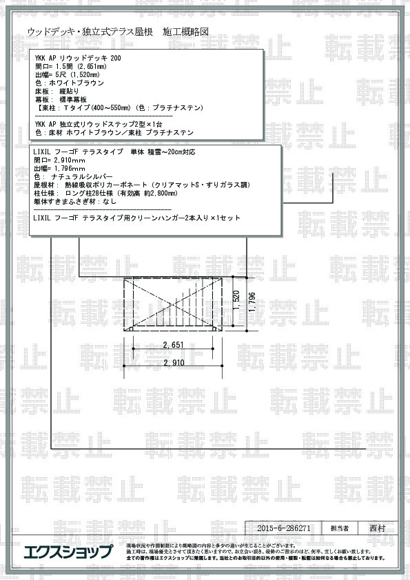 この度はリウッドデッキ200並びにフーゴFの施工をご依頼頂きまして、誠に有り難うございます。お仕上がりに関しましてご不安に思われる点をお持ちとのことでございますが、その後のご利用で商品の様子は如何でしょうか。人工木のウッドデッキには雨水が溜まらないように多少隙間をあける構造になっており、床板の貼り始めと貼り終わりで微妙に差ができてしまう場合があります。施工には万全を期しておりますが、万一ガタツキ等の不具合がございましたら真摯に対応させて頂きたく存じますので、エクスショップまでご連絡下さいますよう、宜しくお願い致します。