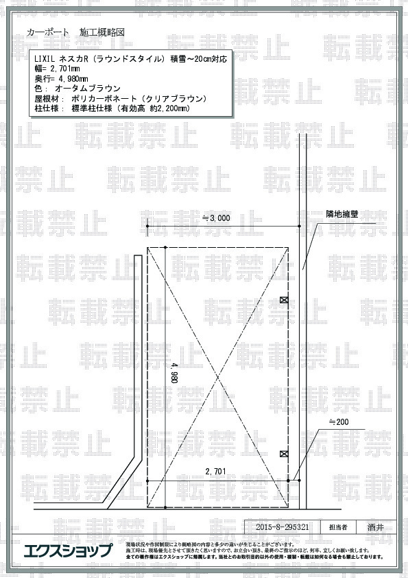 昨年購入した車両は高さが2,250mmあり構造的にルーフには乗れず、洗車がとても大変で苦労していました。現在3連のカーポートはありますが高さが2,400mmの所があり納まりません。高さがクリアーできるカーポートを探した所エクスショップに辿り着きました。価格、保証等説明を聞き、クチコミにも後押しされ決めさせて頂きました。現地調査も準則にして頂き設置も近くの業者様により、2日で完了しました。設置後雨が降りましたが、車両が濡れないため雨垂れ等無くとても満足しております。また機会がありましたらその際は是非お願いしたいと思います。大変有り難う御座いました。