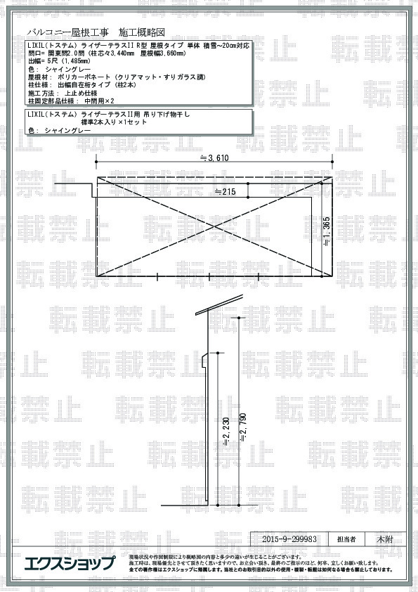 | サイズ | 屋根幅 3,660mm 出幅 1,485mm |