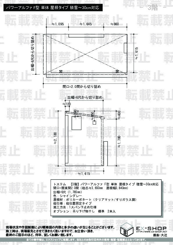 | サイズ | 屋根幅 3,840mm 出幅 1,785mm |
