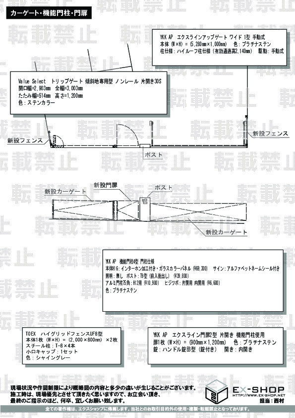 この度は、エクスショップをご利用頂き誠に有難うございます。エクスラインアップゲート ワイド 1型、機能門柱4型、エクスライン門扉2型、トリップゲート 傾斜地専用型 と複数の商品のご依頼を頂きましたが、ステン色で統一され、すっきりとしておりとても素敵でございますね。また、お客様の声もご参考頂き、大変光栄に存じます。今後も、お客様に快適にご利用頂ける様、日々精進して参りますのでまた機会がございましたら是非エクスショップをご利用下さいます様、宜しくお願い致します。