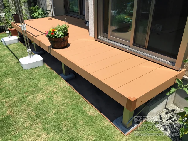 樹ら楽ステージは日光を反射する特殊な顔料を使用した昇温抑制効果のある人工木デッキです。LIXIL社従来商品の類似色比較では最大約10℃まで抑制。また、板厚46mm×175mmの強固な構造で耐久力もあります。滑りによる転倒防止のため、表面はやや粗い仕上がりになっています。