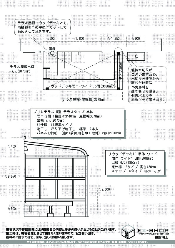 サイズ | 柱芯々 3,440mm 屋根幅 3,678mm 出幅 2,070mm |