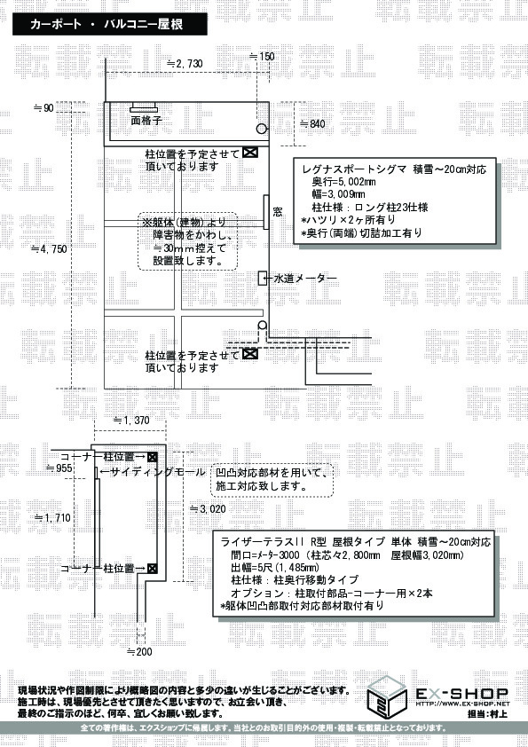| サイズ | 柱芯々 2,800mm 屋根幅 3,020mm 出幅 1,485mm |