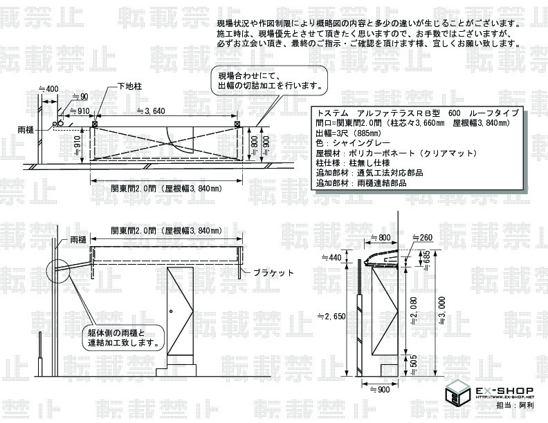 サイズ | 柱芯々 3,660mm 屋根幅 3,840mm 出幅 885mm |