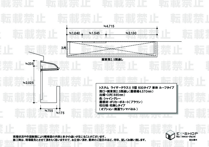 サイズ | 屋根幅 4,570mm 出幅 885mm |