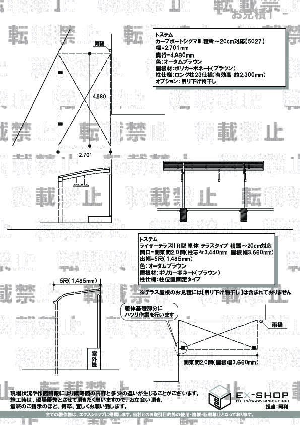 | サイズ | 柱芯々 3,440mm 屋根幅 3,660mm 出幅 1,485mm |