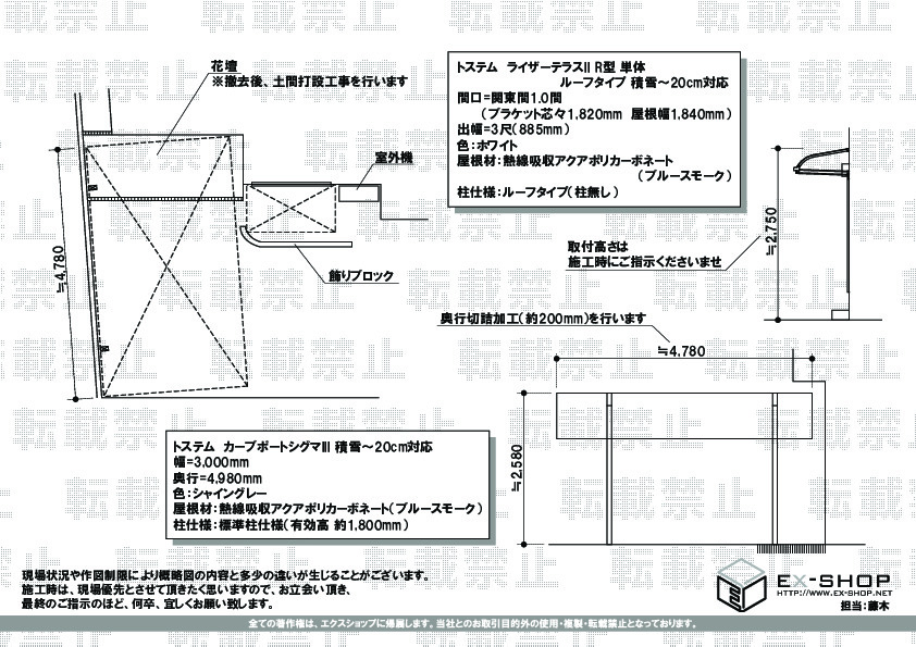 | サイズ | 芯々 1,820mm 屋根幅 1,820mm 出幅 885mm |