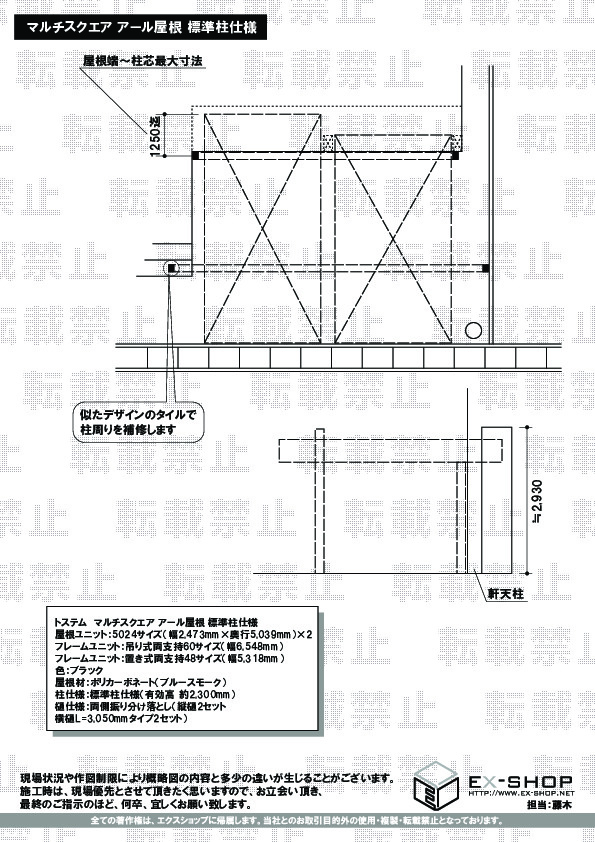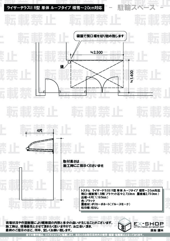 サイズ | ブラケット芯々 2,730mm 屋根幅 2,750mm 出幅 1,185mm |