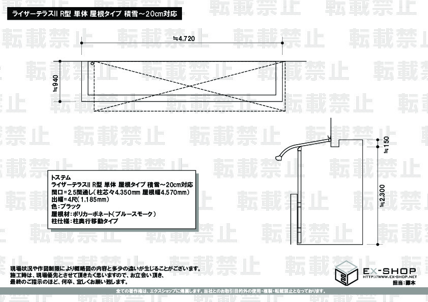 サイズ | 柱芯々 4,350mm 屋根幅 4,570mm 出幅 1,185mm |