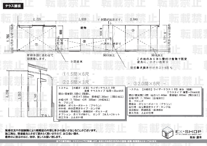サイズ | 屋根幅 3,660mm 出幅 1,785mm |