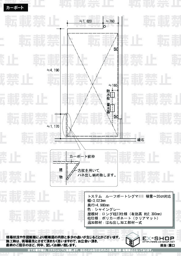 サイズ | 柱芯々 3,440mm 屋根幅 3,660mm 出幅 1,185mm |