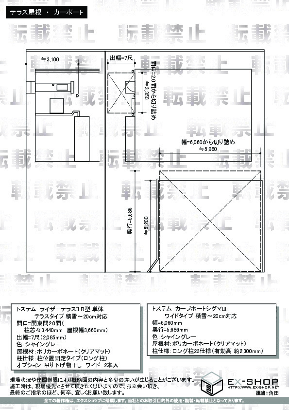 サイズ | 柱芯々 3,440mm 屋根幅 3,660mm 出幅 2,085mm |