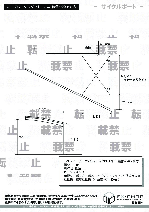 サイズ | 屋根幅 3,660mm 出幅 2,101mm |