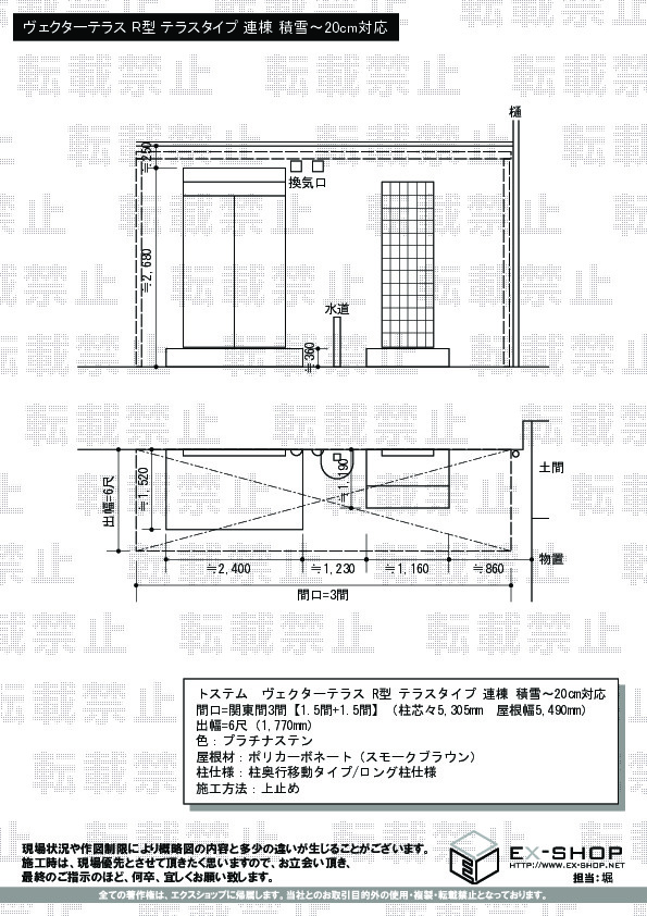| サイズ | 屋根幅 5,490mm 出幅 1,770mm |