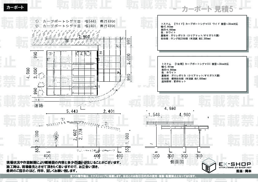 | 屋根高等 | ロング柱23仕様(有効高 約2,300mm)×2 |