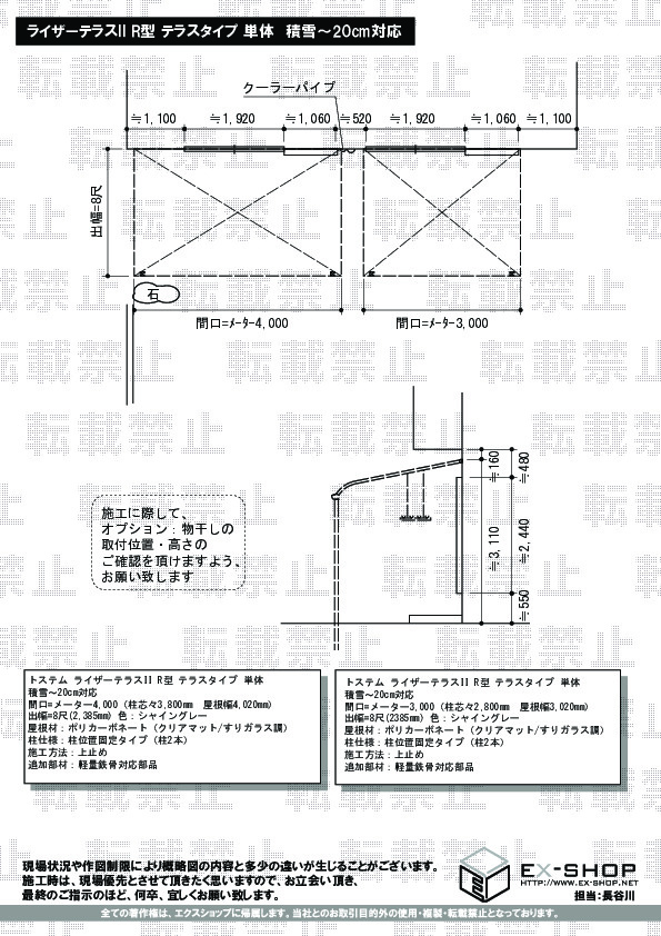 屋根幅の違いますライザーテラスII R型の施工を二点ご依頼頂きまして、誠に有難うございます。お客様の広い敷地に連なります緩やかにカーブしたお屋根が、大変美しいですね。日々、どのような対応をすればお客様に安心してご利用頂けるかと、試行錯誤を繰り返しているスタッフにとりましては、このようなお褒めのお言葉が何よりの励みになります。これからも、お客様のご期待を裏切らないよう精進して参りますので、また機会がございましたら、ぜひエクスショップをご利用頂けますよう、宜しくお願い致します。