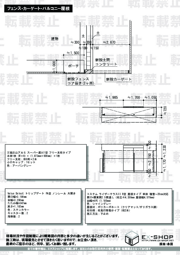 数多くのショップの中からエクスショップをご利用頂き、誠に有り難うございます。 フェンスは、主張しすぎず、綺麗なお仕上がりでございますね。トリップゲートはシンプルなデザインながら、しっかりとお車をガードしてくれる、逞しさがございますね。ライザーテラスII R型 屋根タイプはご自宅の雰囲気を損なうことの無いお仕上がりでございますね。今後もお客様にご満足頂けるよう、日々精進して参ります。また機会がございましたら、エクスショップにご用命頂きますよう、宜しくお願い致します。