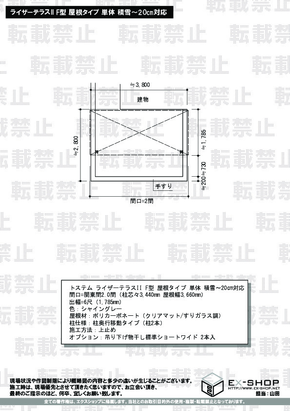 サイズ | 屋根幅 3,660mm 出幅 1,785mm |