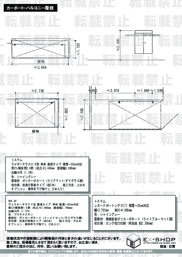 サイズ | 屋根幅 3,660mm 出幅 1,185mm |