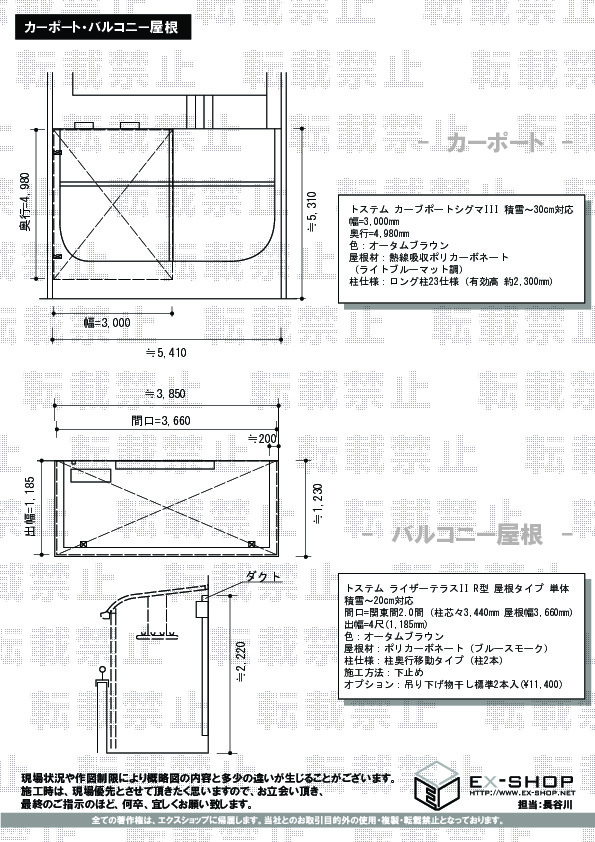サイズ | 屋根幅 3,660mm 出幅 1,185mm |