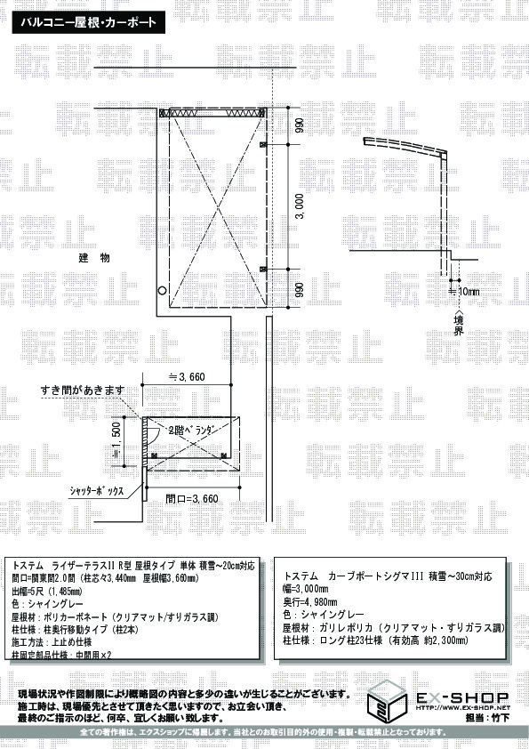 サイズ | 屋根幅 3,660mm 出幅 1,485mm |