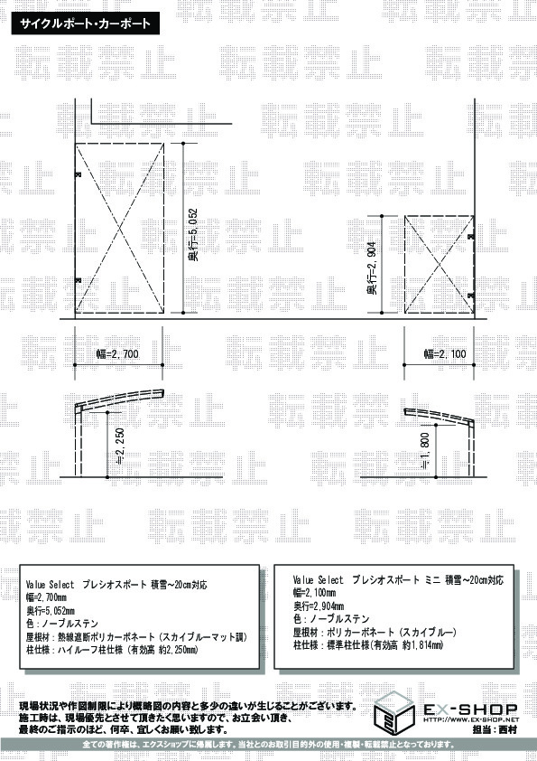 プレシオスポート ミニはアール屋根・片流れタイプのエクスショップオリジナルブランドのスタンダードサイクルポートです。基準風速Vo=34m/sの耐風性能と20cm相当(600N/㎡)の耐積雪性能を兼ね備えています。自転車は約3〜4台駐輪可能です。