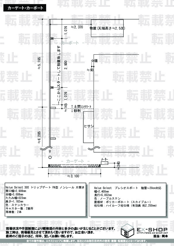 この度は、トリップゲート及びプレシオスポートの施工ご依頼を頂き誠に有り難うございます。ご依頼より完了までにお時間を頂戴致しましたこと、誠に申し訳ございませんでした。シンプルですっきりとしたカーゲートに爽やかなカーポートがご自宅とマッチしておりますね。弊社オリジナルブランドでございますValue Selectをお気に召して頂き末永くご利用頂ければ幸いでございます。今後も、日々精進して参りますのでまた機会がございましたら是非エクスショップをご利用下さいますよう、宜しくお願い致します。
