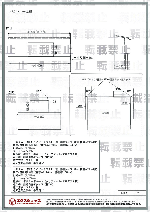 | サイズ | 屋根幅 4,570mm 出幅 1,185mm |
