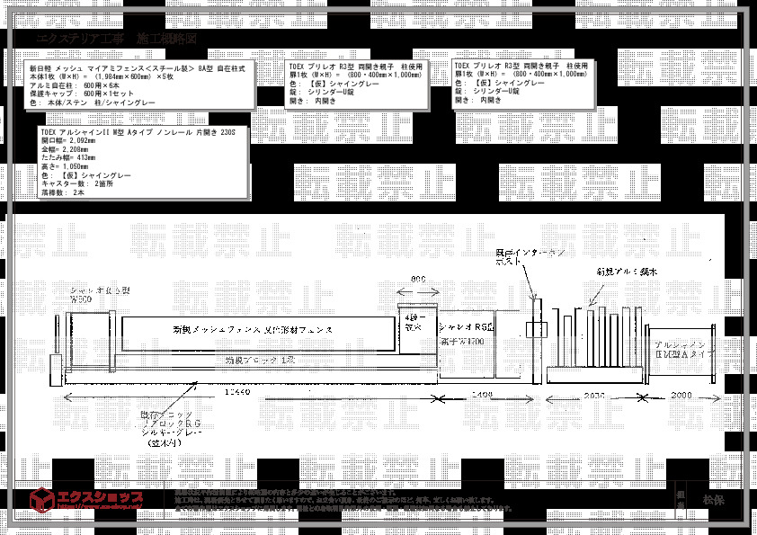 この度はメッシュ マイアミフェンス<スチール製> 8A型 、プリレオ R3型 両開き親子、アルシャインII M型 Aタイプ ノンレール 片開き及びプレシオスポート ワイドの施工をご依頼頂き、誠に有り難うございました。複数の商品を同時に施工致しましたが、全ての商品が綺麗に納まり素敵なお仕上がりでございますね。いずれも耐久性に優れ、大変機能的な商品でございますので、お気に召して頂き、永くご愛用頂けますと幸いでございます。施工概略図につきましてご意見を頂き、有り難うございました。お客様から頂いたご意見は、今後の業務に必ず活かして参ります。また機会がございましたら、是非エクスショップにご用命くださいますよう、宜しくお願い致します。
