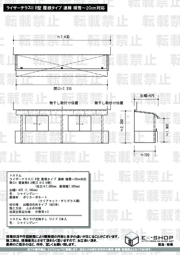サイズ | 屋根幅 7,300mm 出幅 1,185mm |