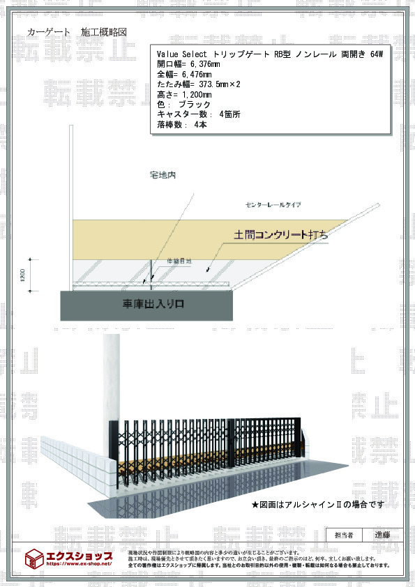 トリップゲートU 2型 スタンダード ノンレール 両開きはエクスショップオリジナルブランドの伸縮式カーゲートの両開きタイプです。幅が2,325〜12,605mmの間で21パターンあり、1台用から複数台用の駐車スペースまで対応可能です。