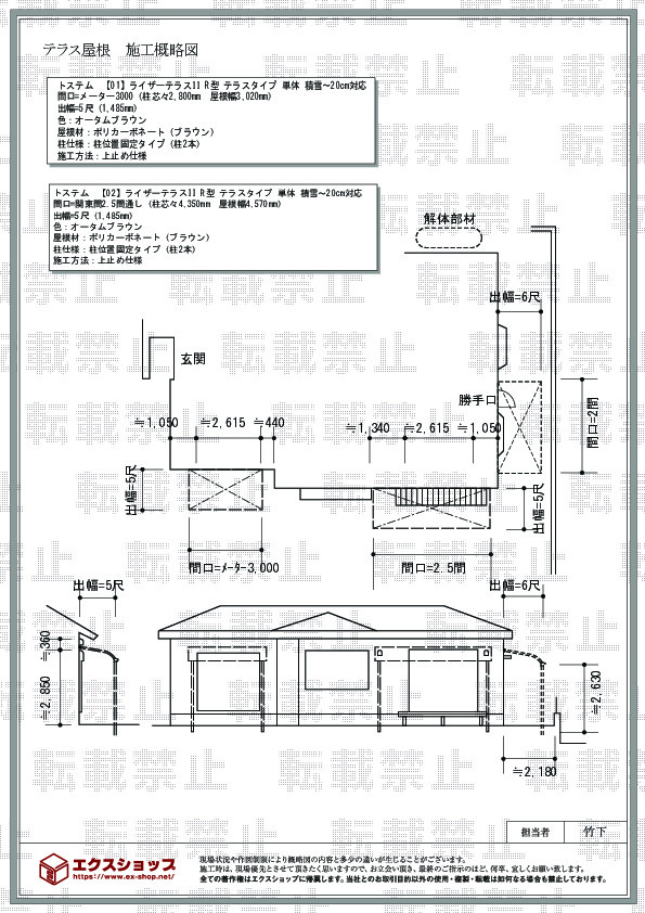 | サイズ | 屋根幅 4,570mm 出幅 1,485mm |