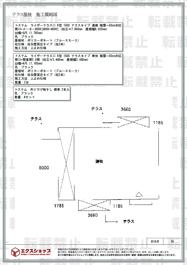 | サイズ | 屋根幅 3,660mm 出幅 1,185mm |