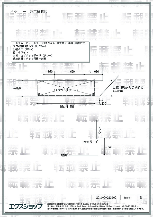 プレシオステラス R型とビューステージHスタイル 縦太格子の施工をご依頼頂きまして、誠に有り難うございます。現場調査のご依頼を頂いてから、施工が完了するまで、全てお客様にご満足頂けましたこと、大変嬉しく存じます。1階ベランダを真上から撮影した、貴重な施工写真をお送り頂き、有り難うございました。これから施工をご検討されるお客様にとりまして、大変参考になるものと存じます。今後も変わらず、お客様のご満足の為に精進して参りたいと存じますので、また機会がございましたら、お気軽にエクスショップにご用命くださいますよう宜しくお願い致します。
