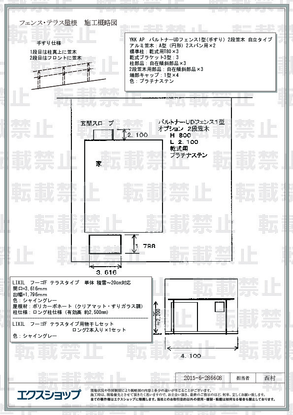 この度は、フェンス、フーゴF テラスタイプの施工をご依頼頂きまして、誠に有り難うございました。お客様のご期待にお応え出来、大変嬉しく存じます。手すりを設置することで、高齢者の方も安心して足を運ぶことが出来ますね。今後もお客様の笑顔のため、日々精進して参ります。また機会がございましたら、エクスショップをご用命頂きますよう、宜しくお願い致します。