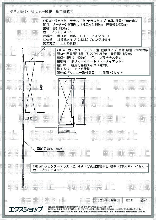 ヴェクターテラス F型 テラスタイプとヴェクターテラス R 屋根タイプの施工をご依頼頂きまして、誠に有り難うございます。バルコニー屋根が完成したことにより、空模様を気にすることなくお洗濯物を干して頂けるかと存じます。また、お庭に雨や直射日光を遮るスペースが出来たことにより、ゴミを出したり、物を置かれたりとご活用頂けるものと存じます。これからも、お客様の暮らしがより快適になりますよう、エクステリアの施工を通してお手伝いして参ります。また機会がございましたら、是非エクスショップにご用命頂きますよう、宜しくお願い致します。